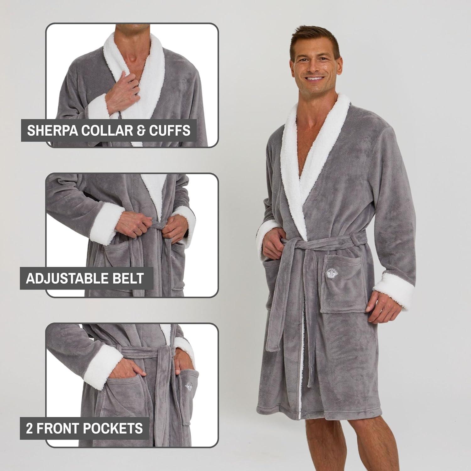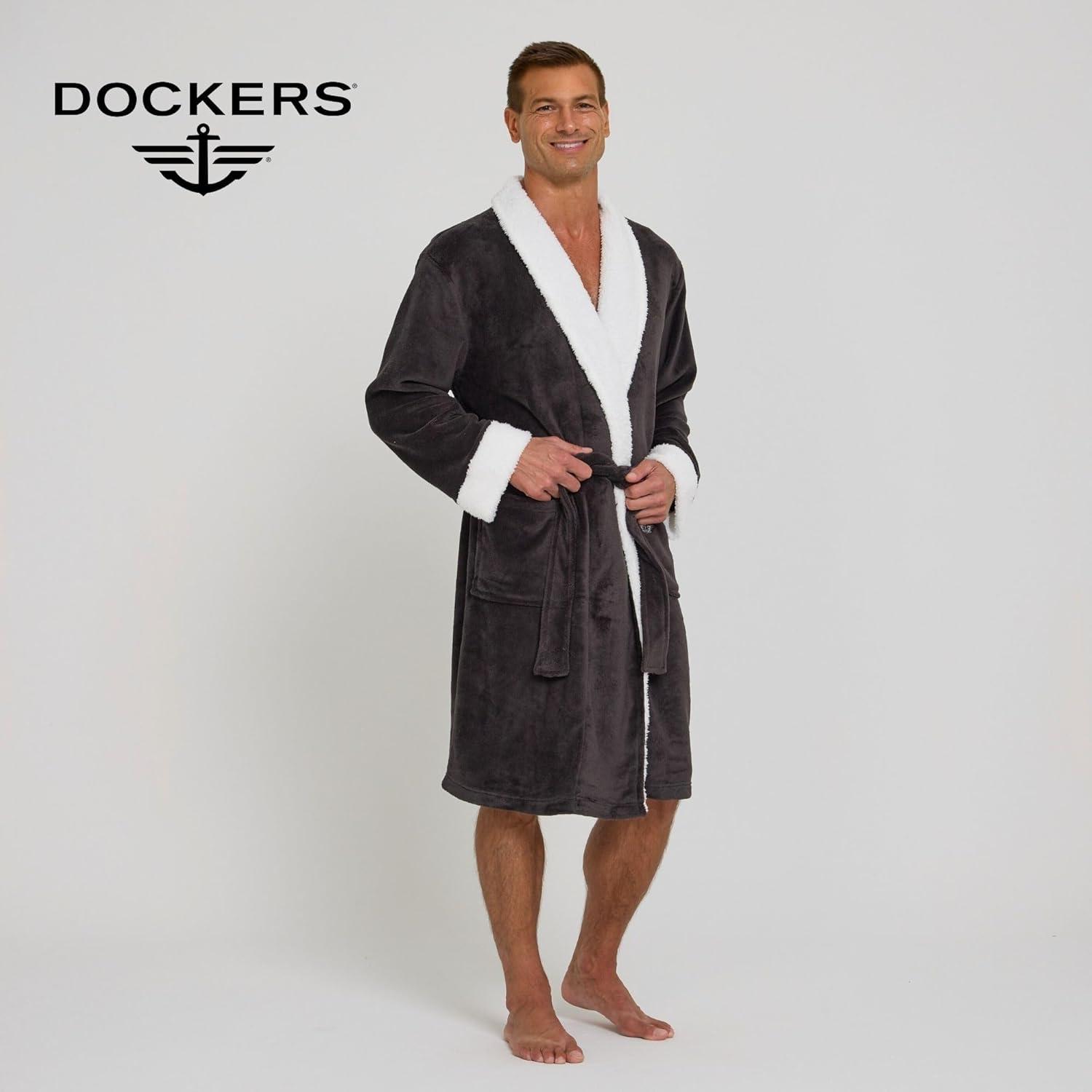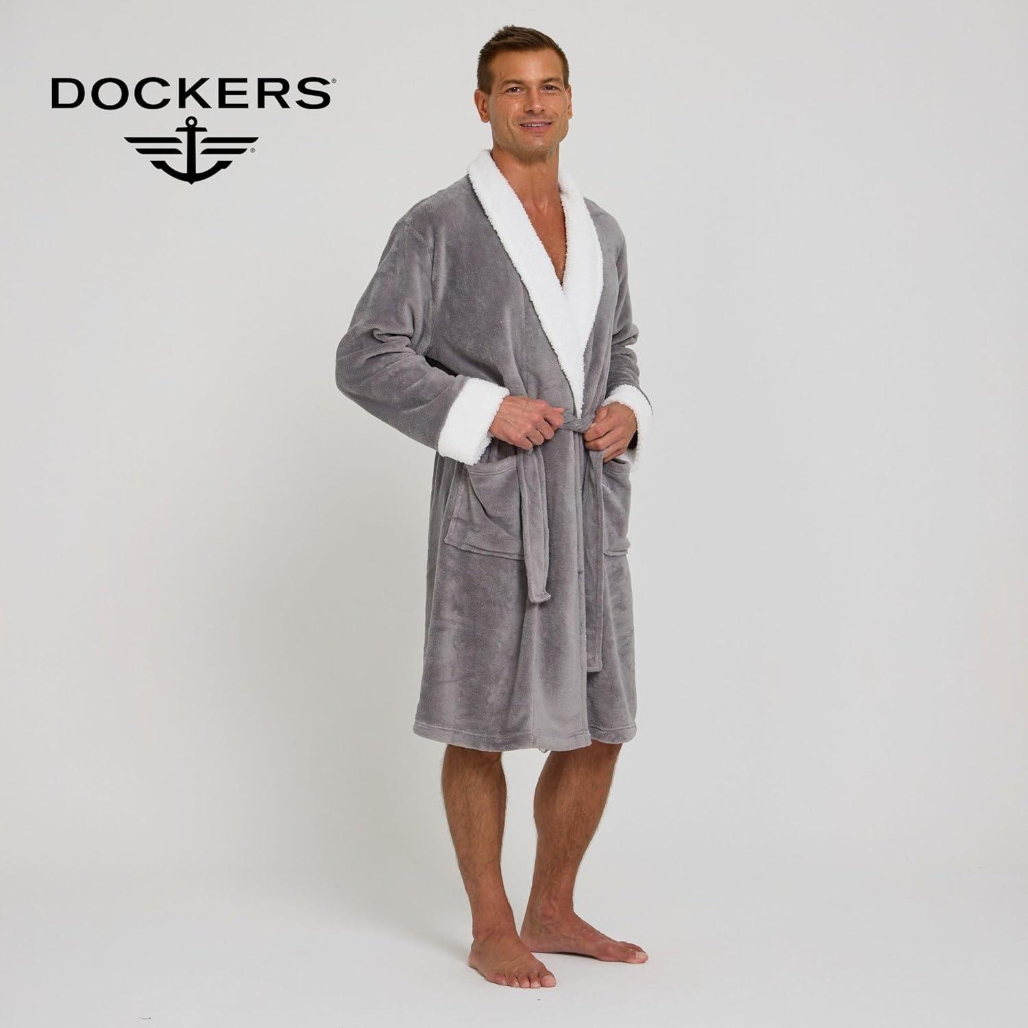 DOCKERS Mens Bath Robe for Men Plush Sherpa Shower Robe with Pockets(Grey)
