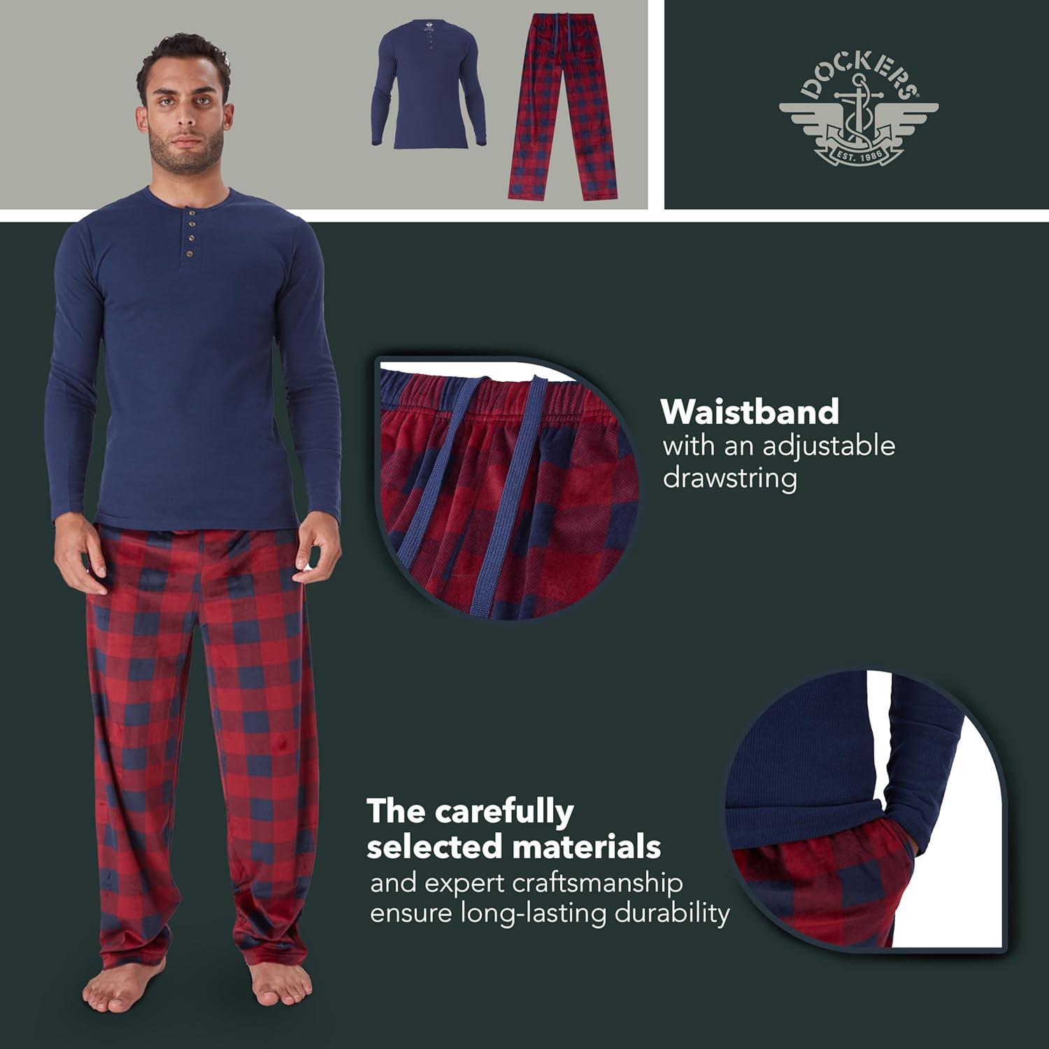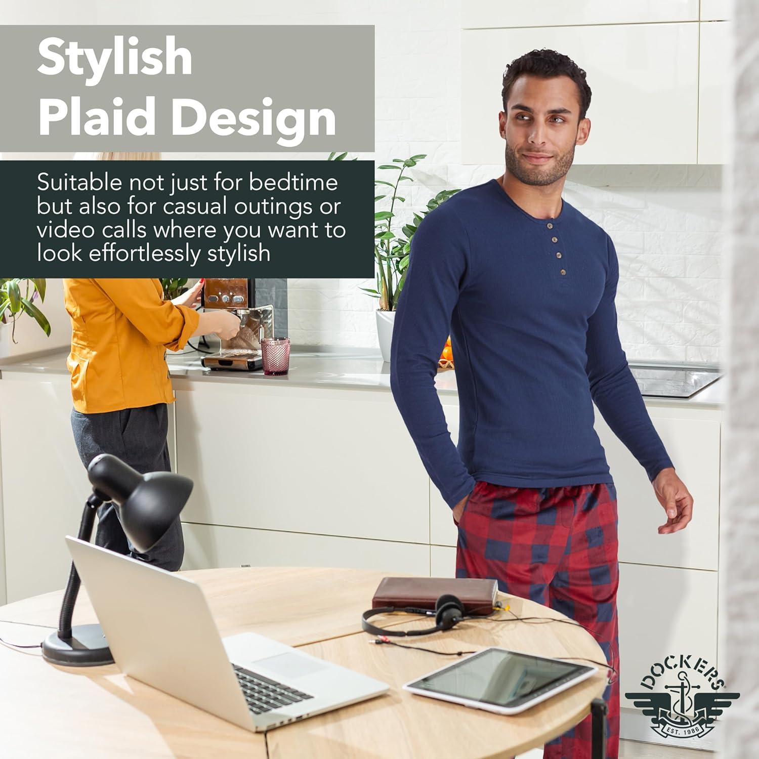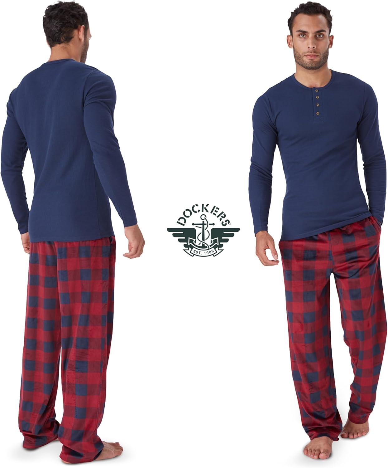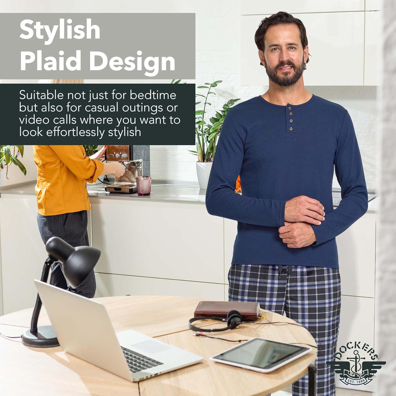 DOCKERS Men’s Pajama Sets, Plaid PJ Pants for Men Lounge Set Long Sleeve Shirt Plaid Bottoms(Navy/Blk)