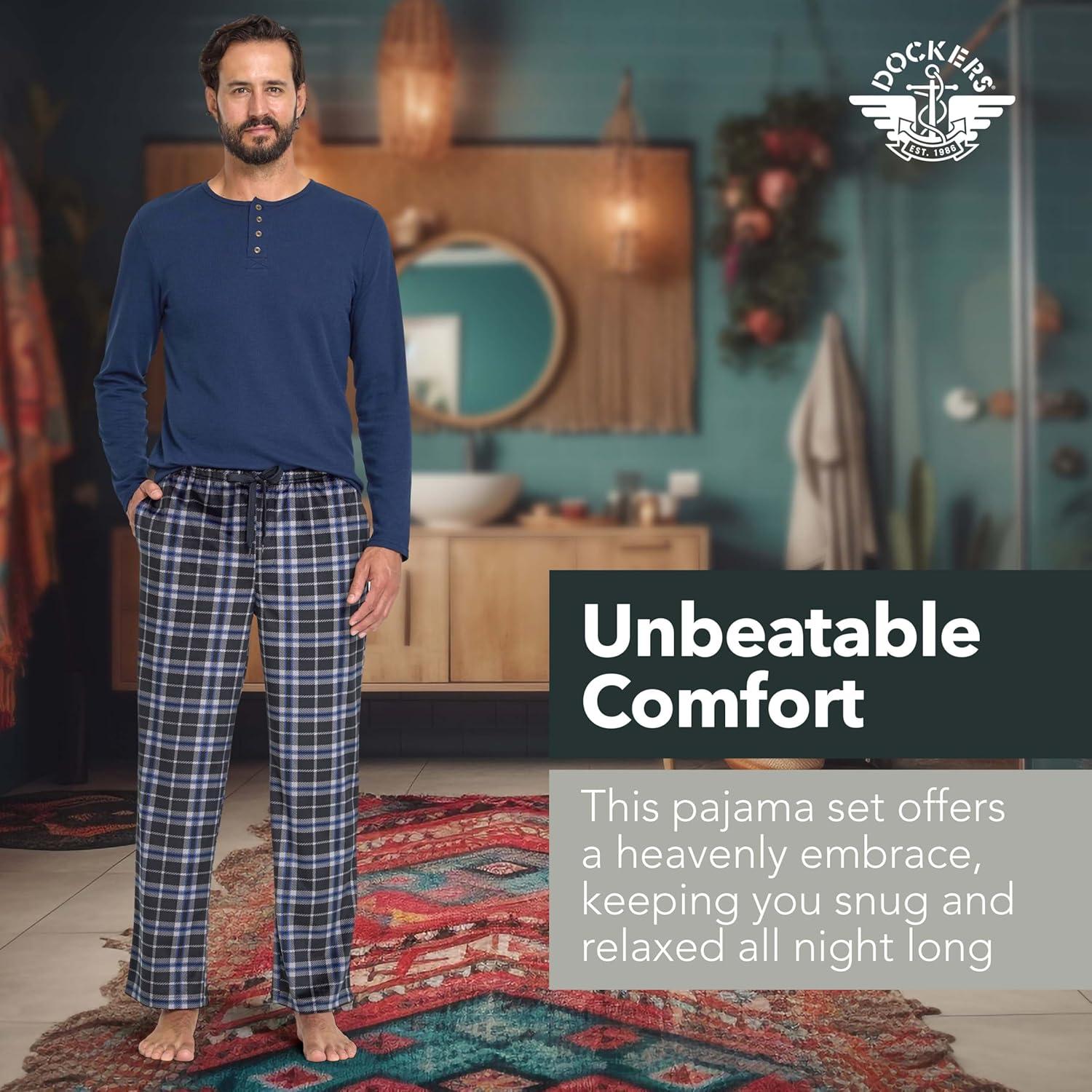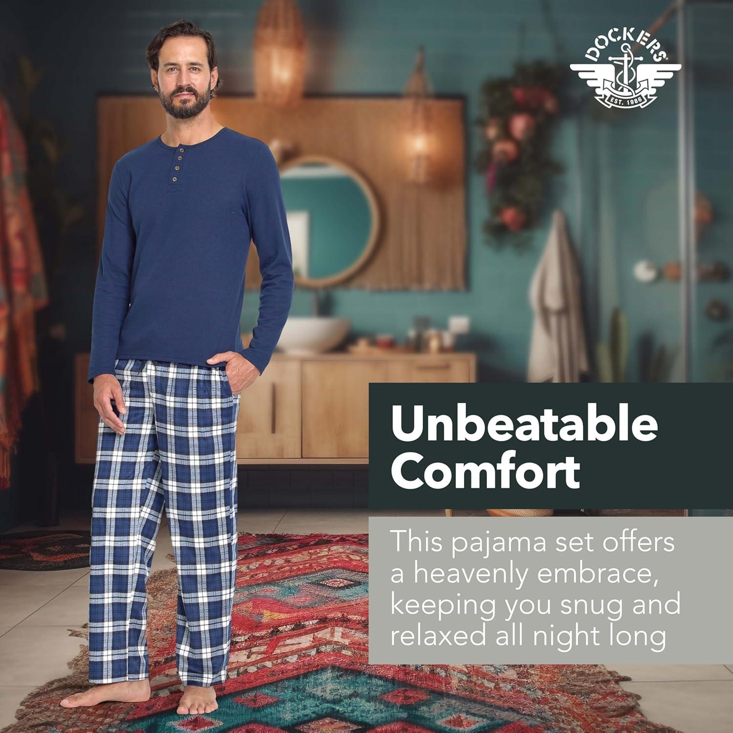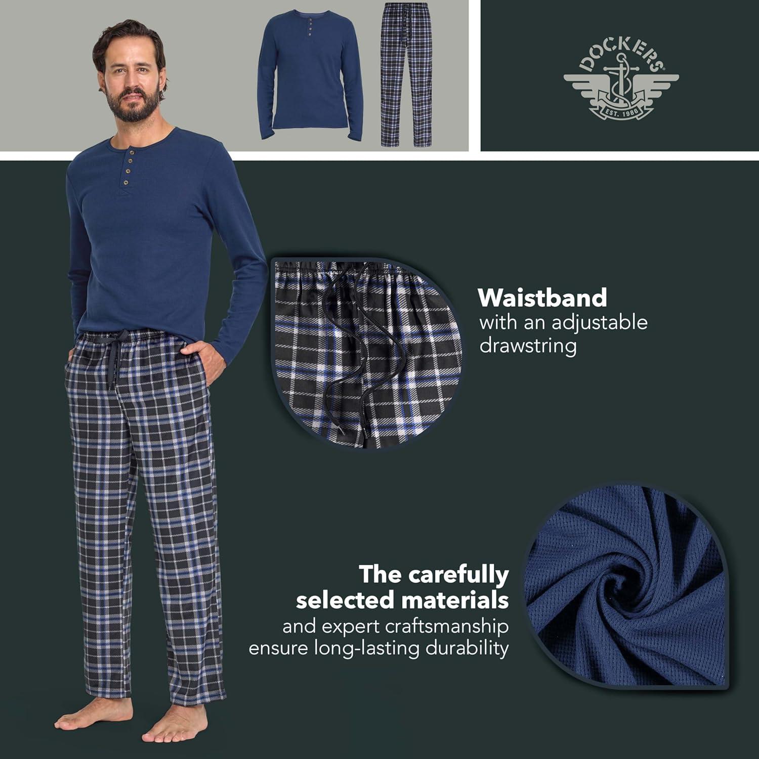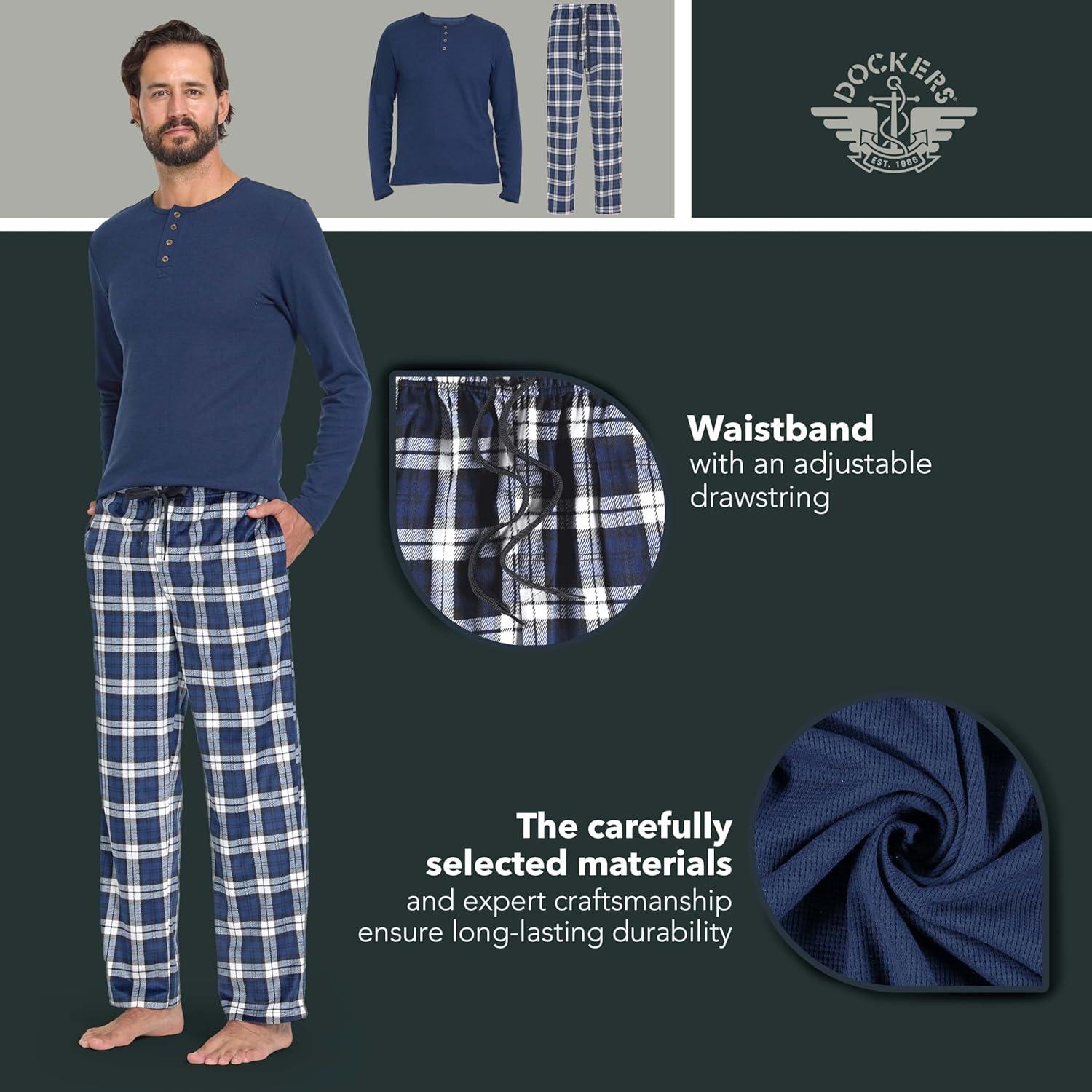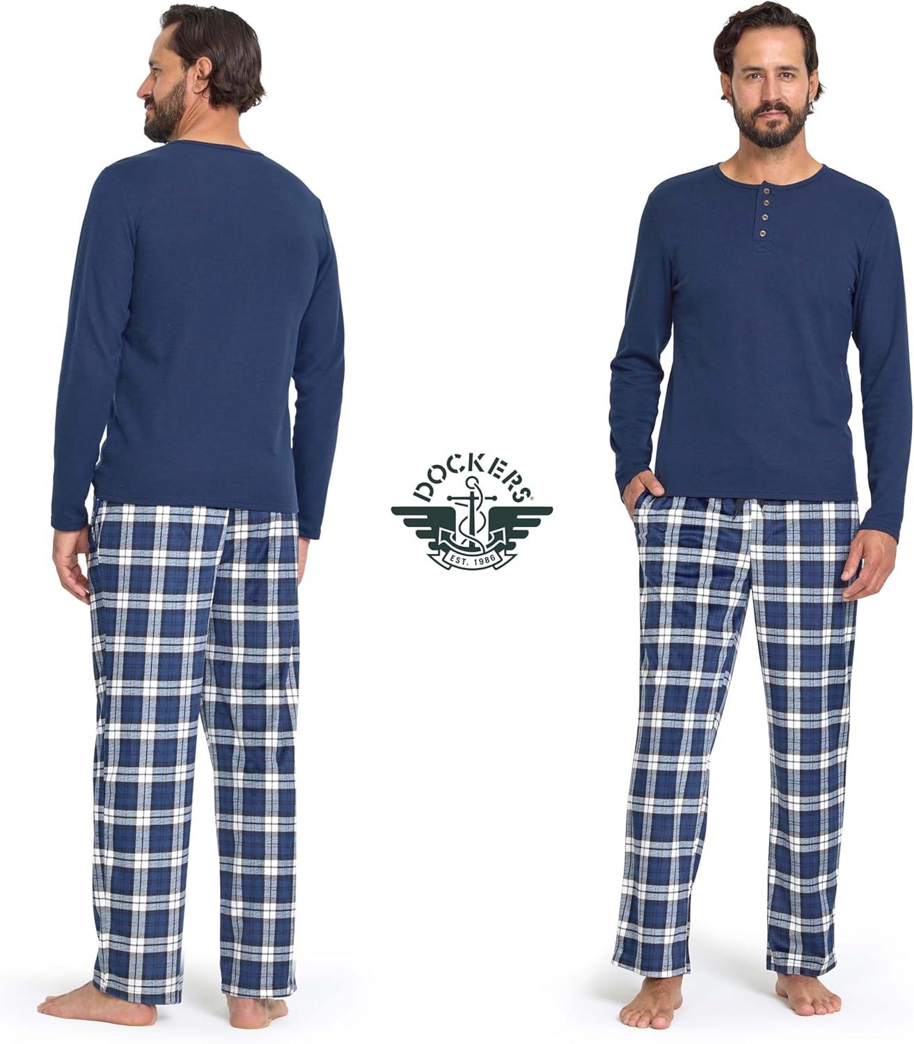 DOCKERS Men’s Pajama Sets, Plaid PJ Pants for Men Lounge Set Long Sleeve Shirt Plaid Bottoms(Navy)