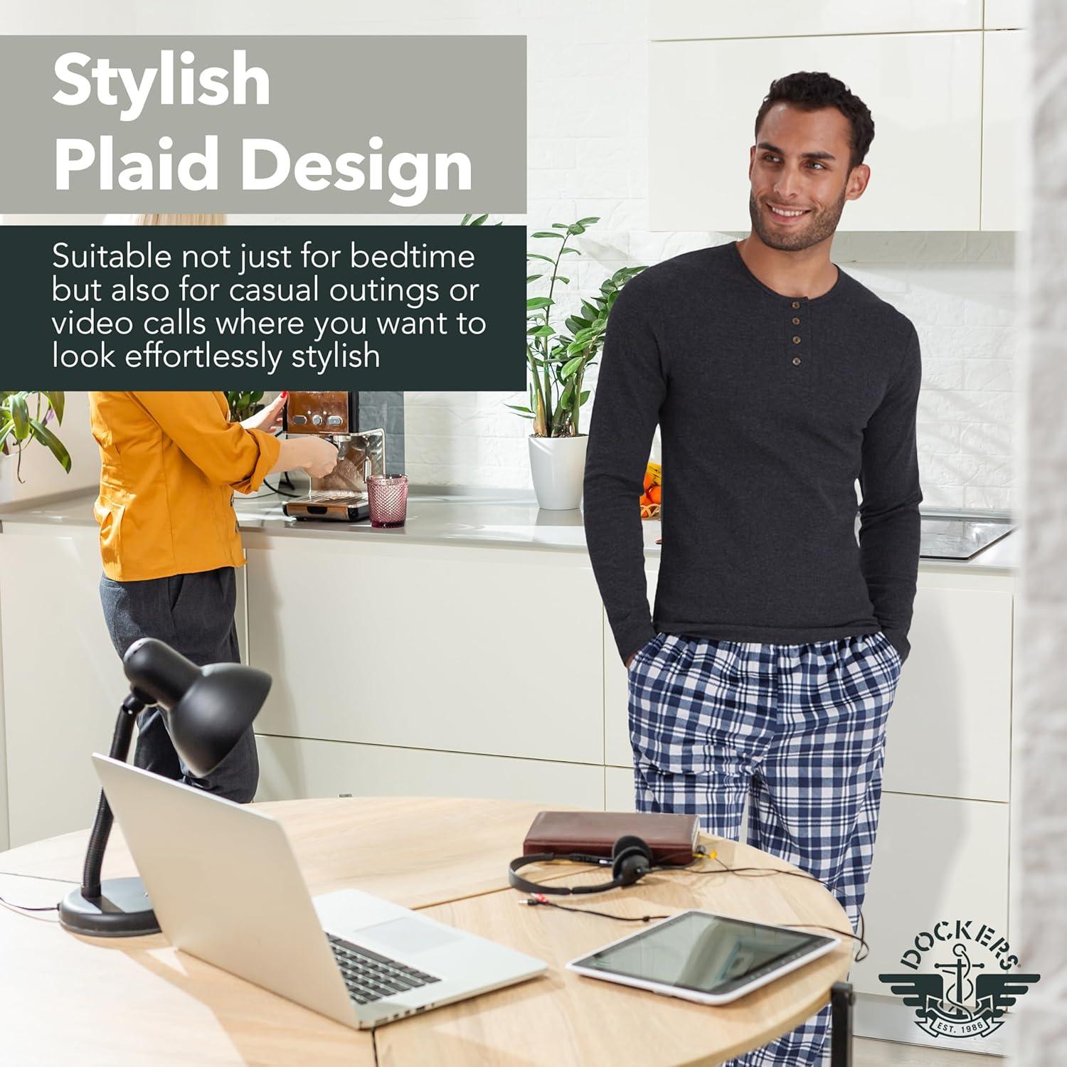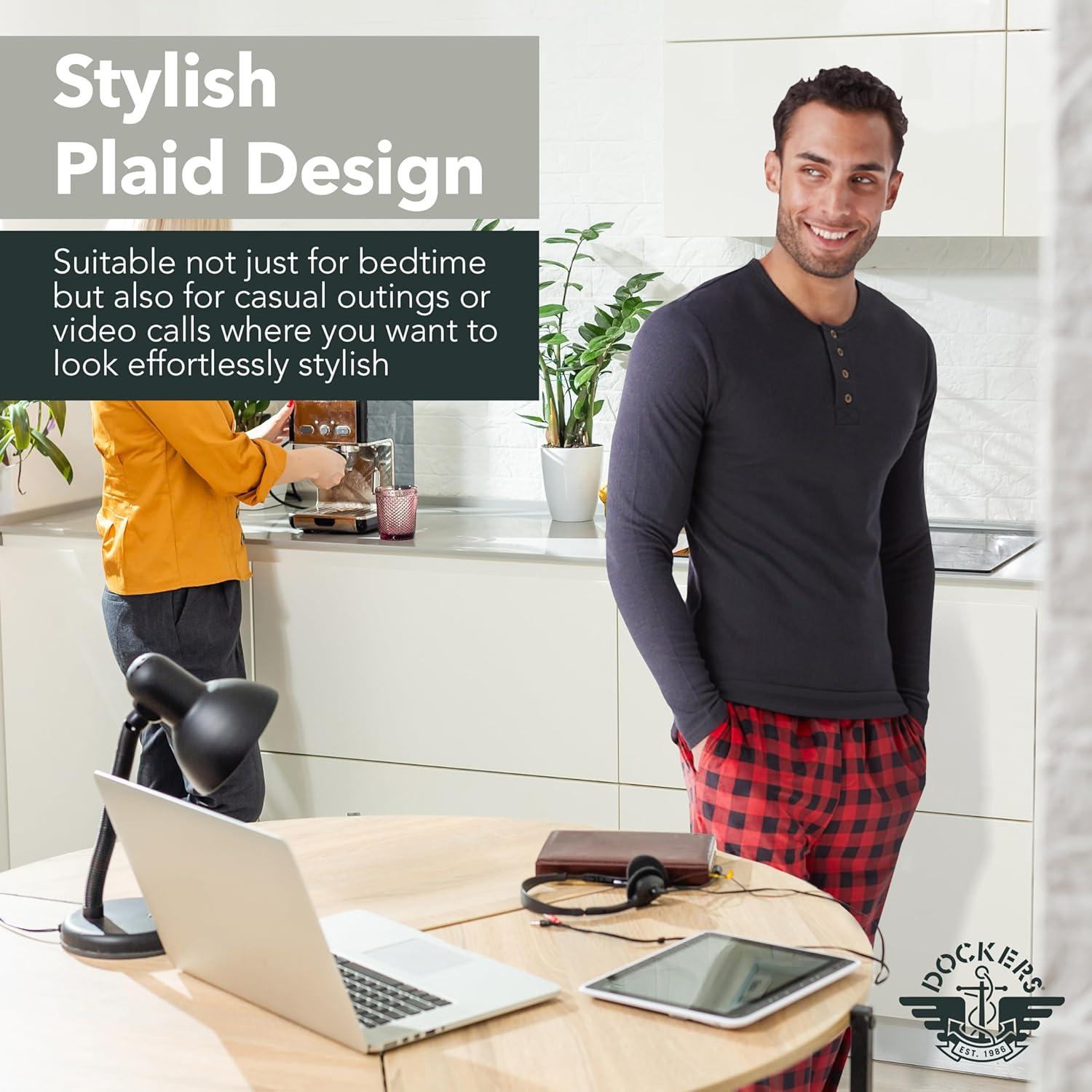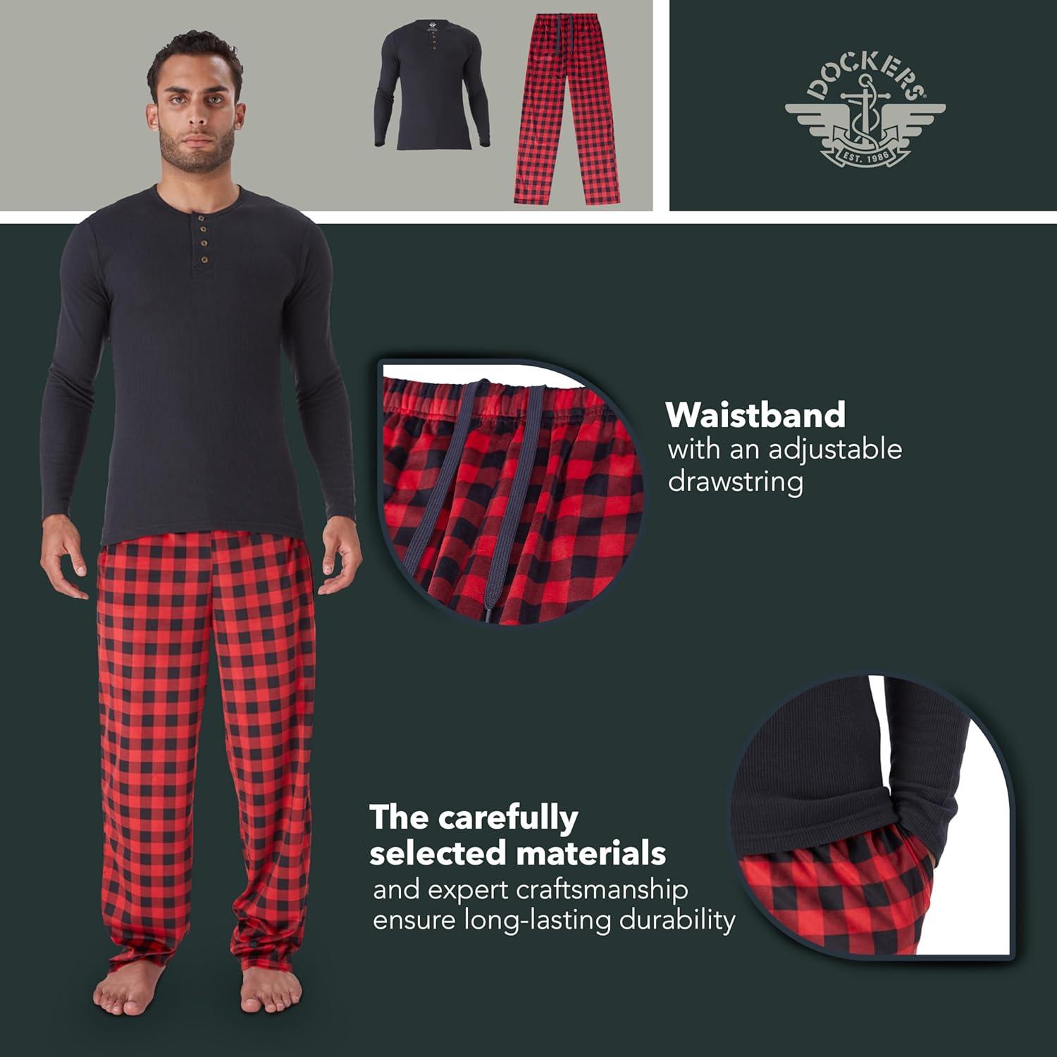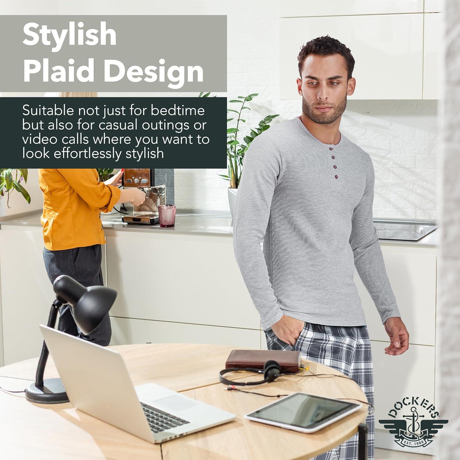DOCKERS Men’s Pajama Sets, Plaid PJ Pants for Men Lounge Set Long Sleeve Shirt Plaid Bottoms(Black/Grey)
