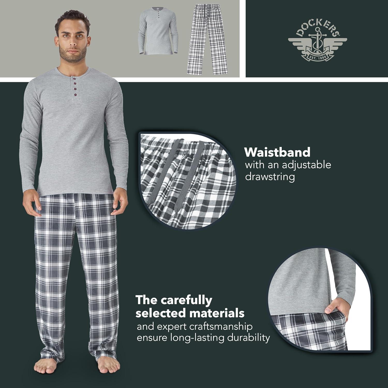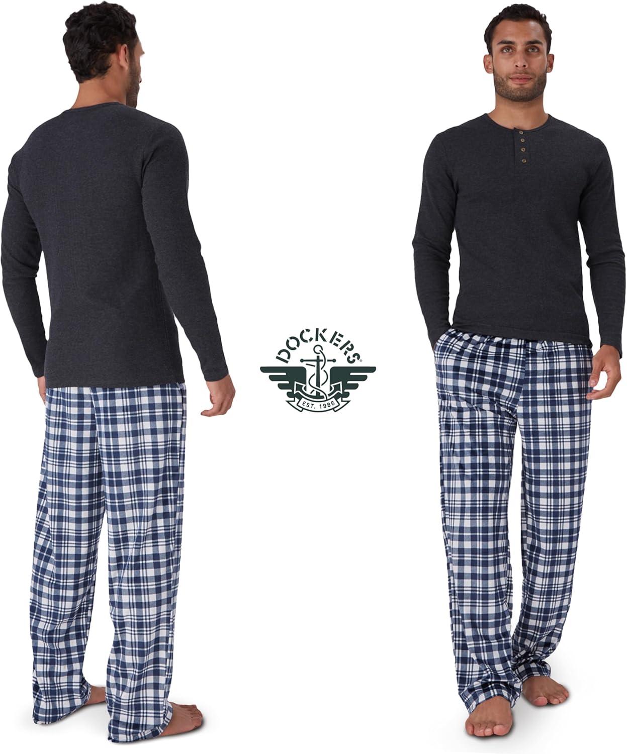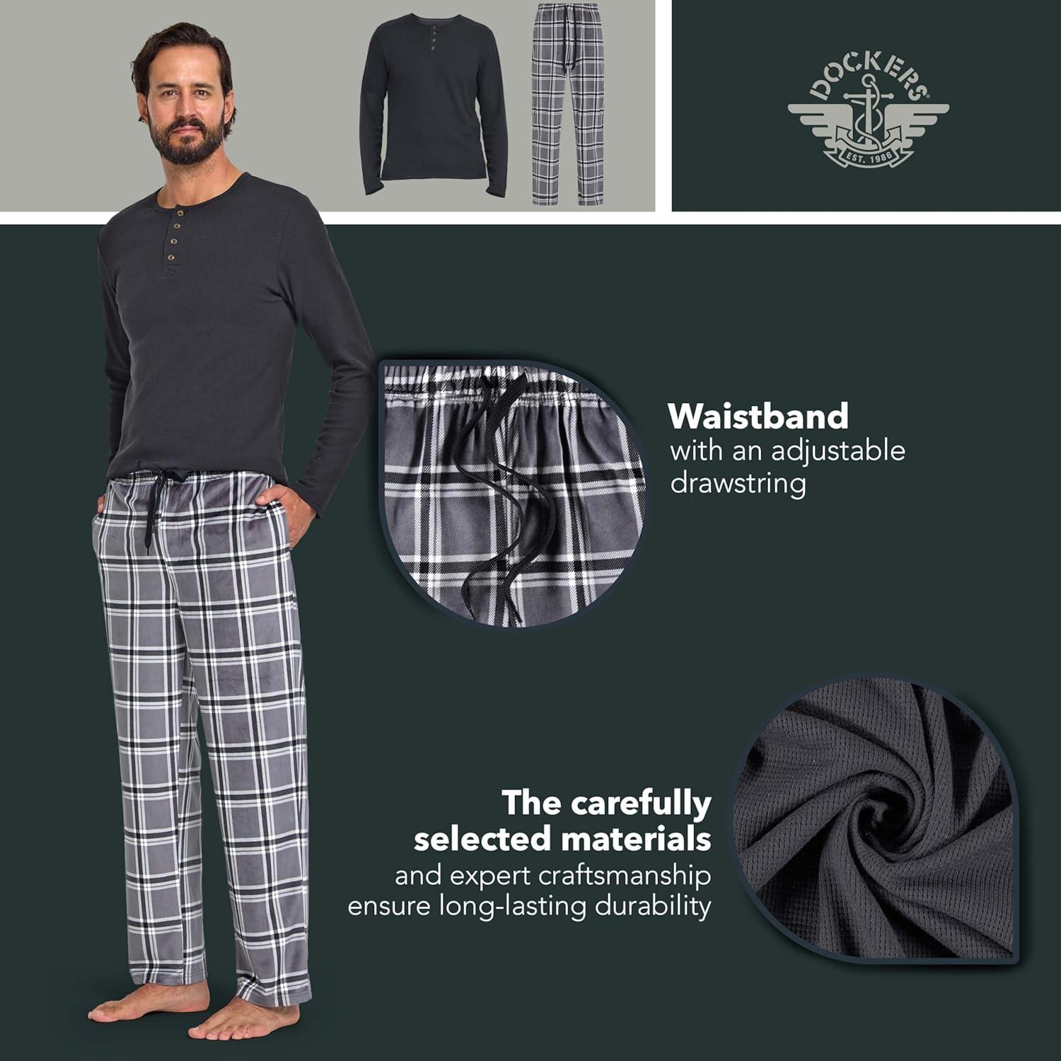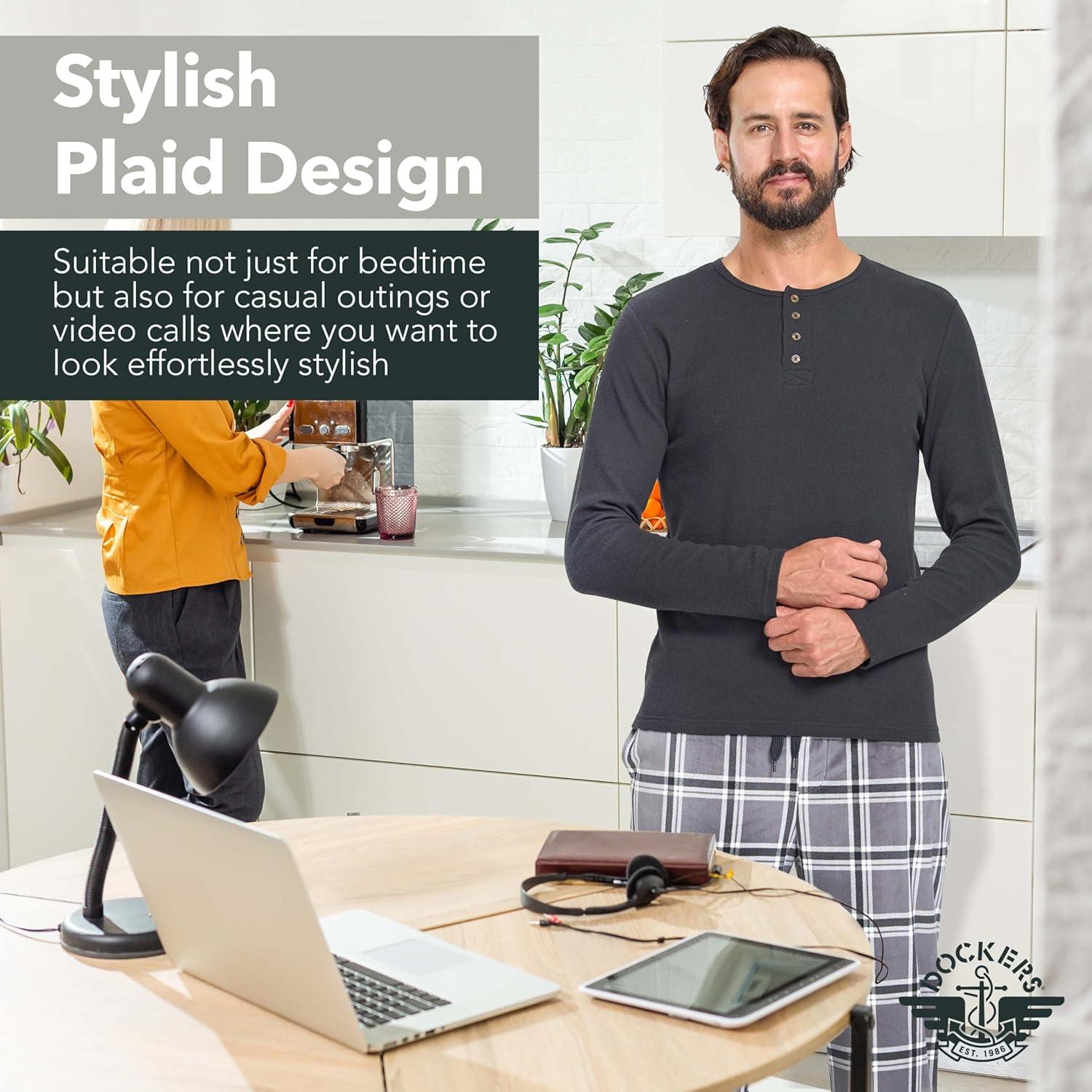 DOCKERS Men’s Pajama Sets, Plaid PJ Pants for Men Lounge Set Long Sleeve Shirt Plaid Bottoms(Dark Grey)
