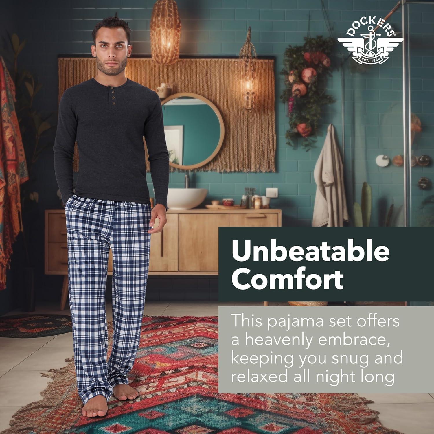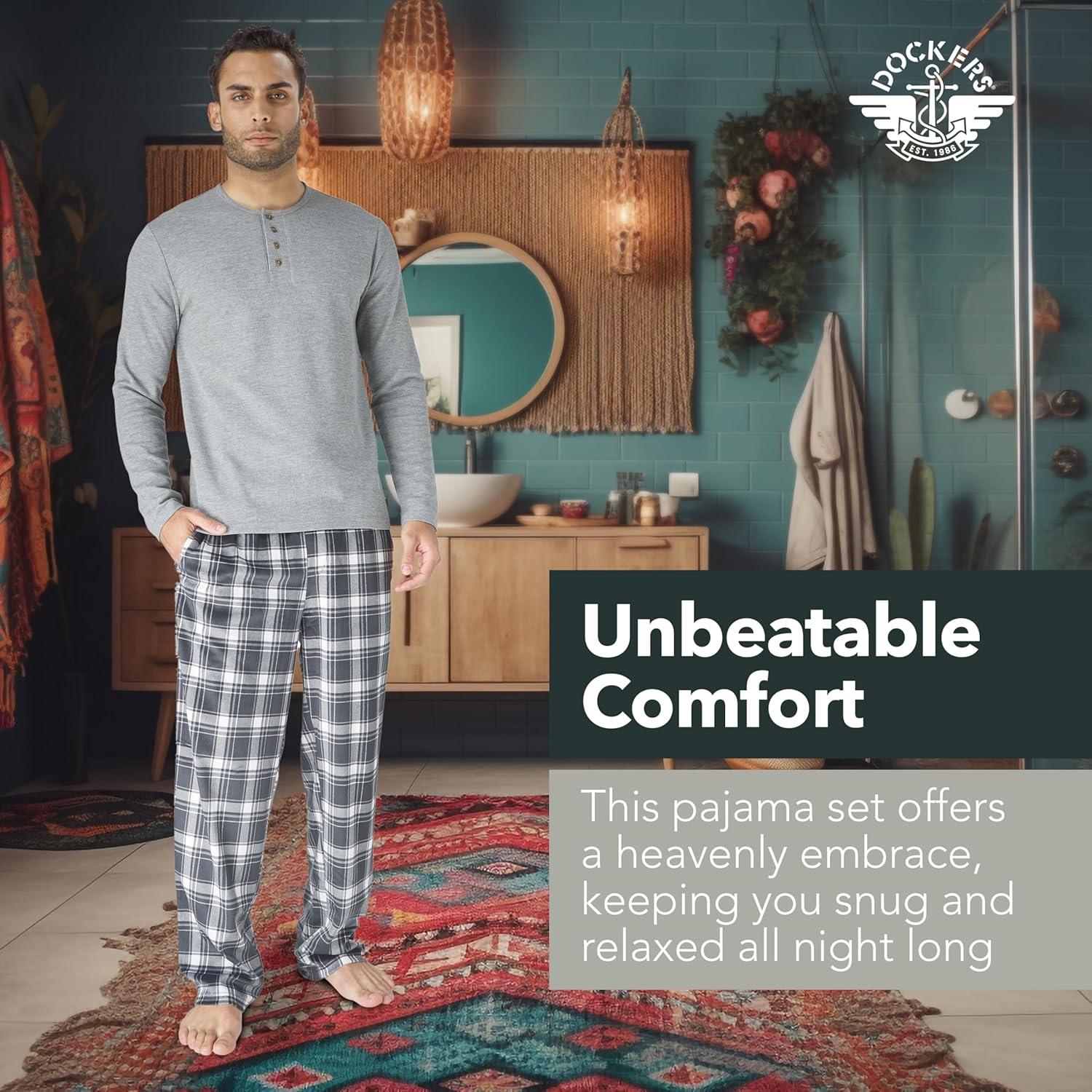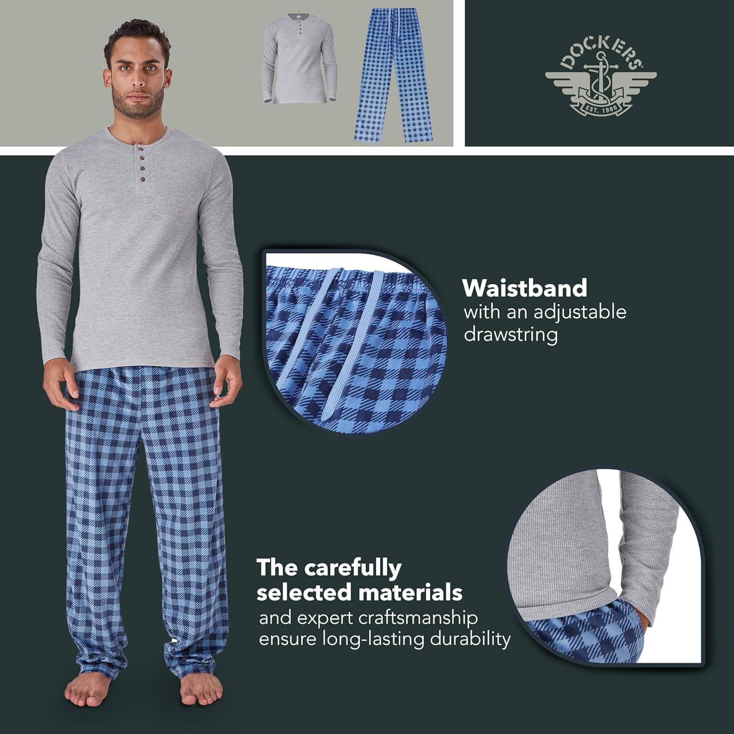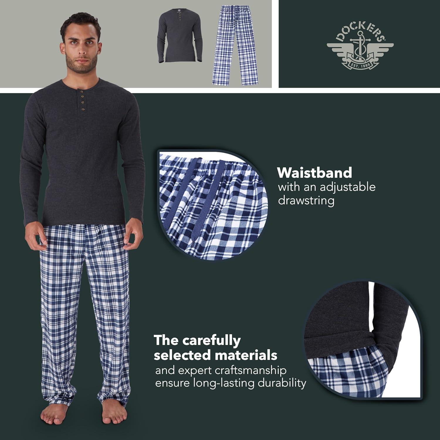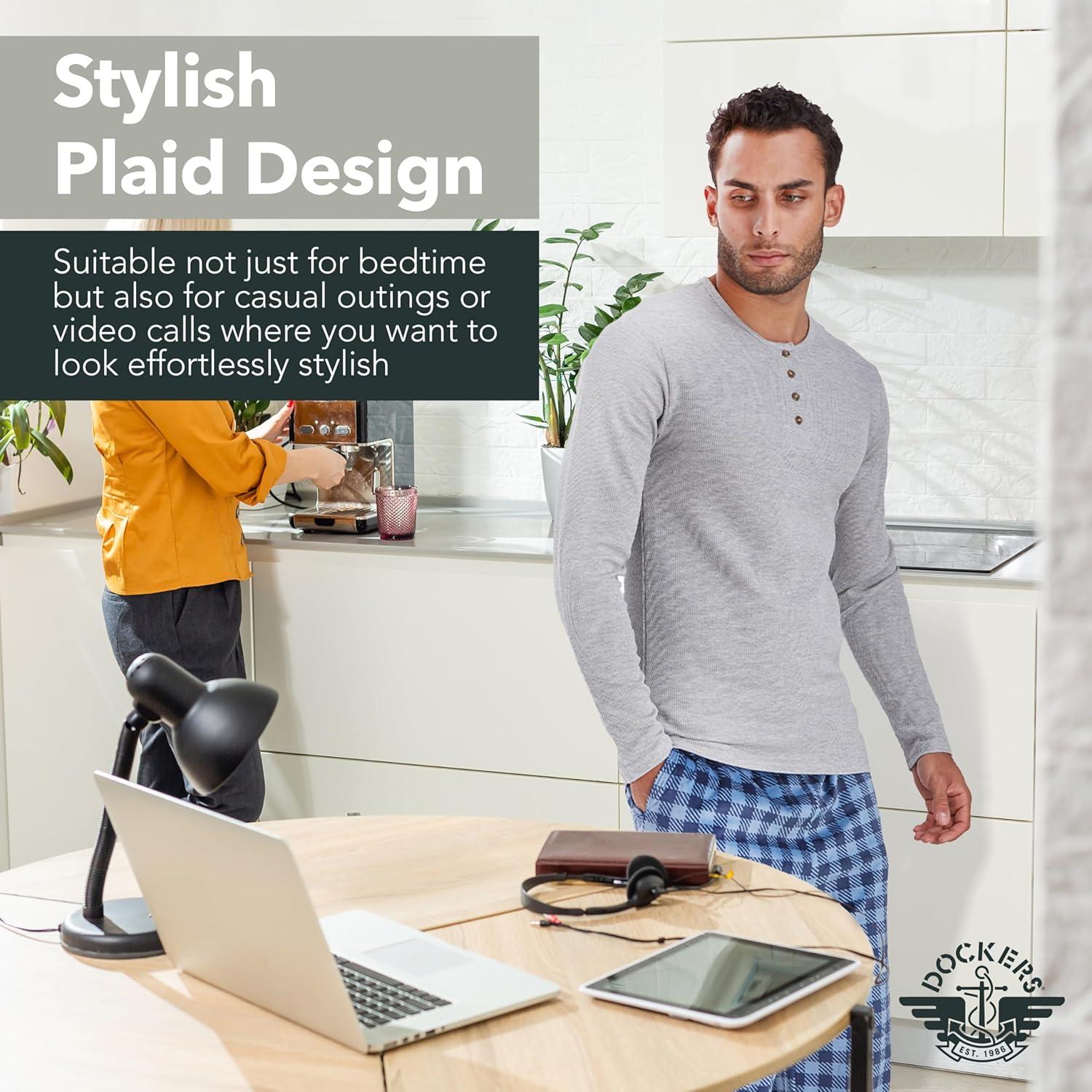 DOCKERS Men’s Pajama Sets, Plaid PJ Pants for Men Lounge Set Long Sleeve Shirt Plaid Bottoms(Dark Grey)