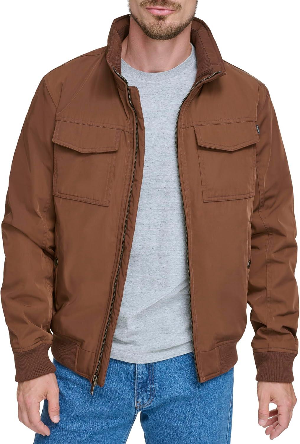 WARM FEATURES: Down alternative insulation giving the ability to lock in warmth; Featuring a quilted lining pattern for functionality and comfort; Heat is secured within each stitched quilt. PRACTICALITY: A favorable front zipper extending the length of the jacket is featured along with 2 chest flap pockets, 2 lower hand pockets with snap closures and one interior safety zipper pocket; The side entry and chest pockets create spacious and easily accessible pockets. The stand collar includes a zip out hood to hide for style and expose for functionality. STYLISH AND POLISHED: The Dockers anchor logo is embroidered on the left chest, rib knit detail inside the stand collar to align with the rib knit cuffs and hem for a sporty bomber look.