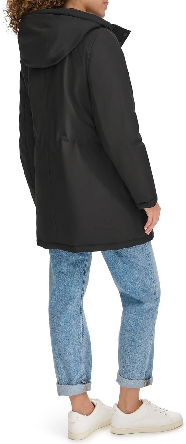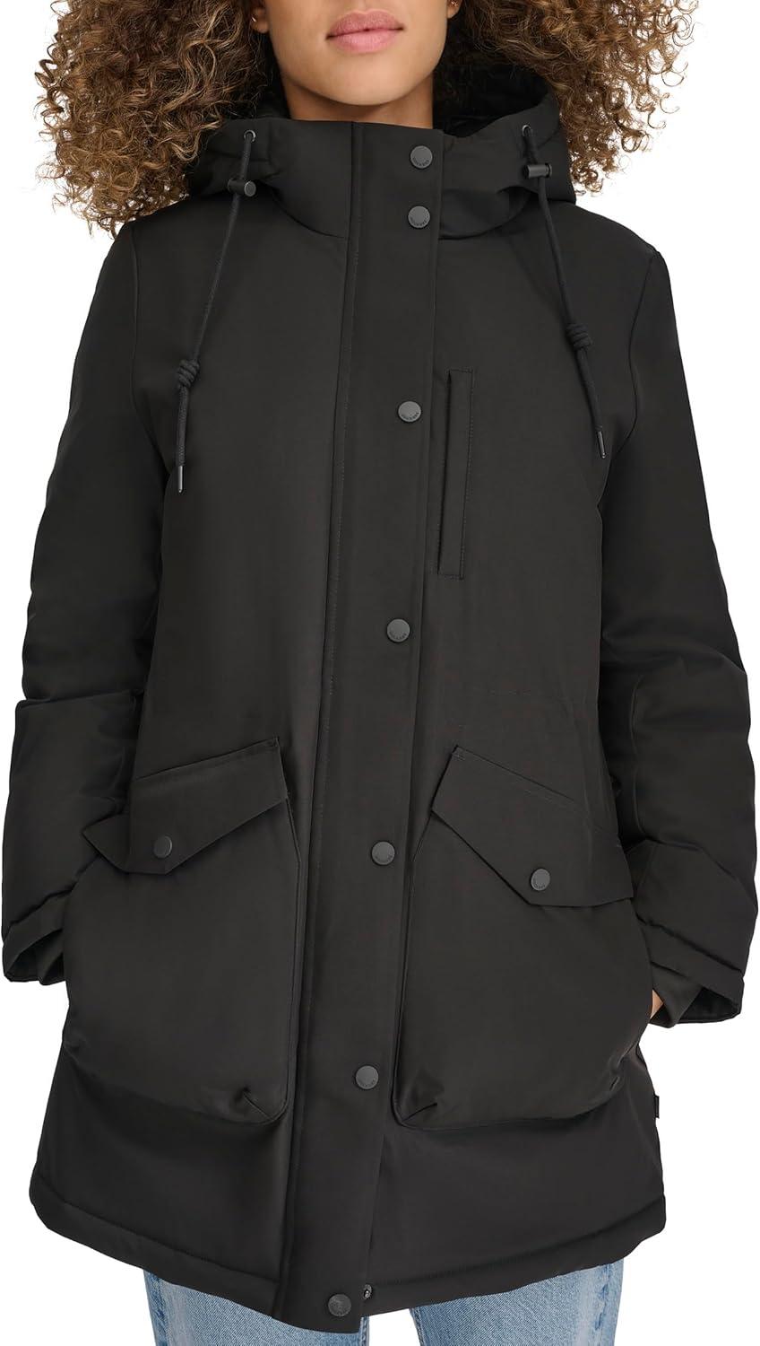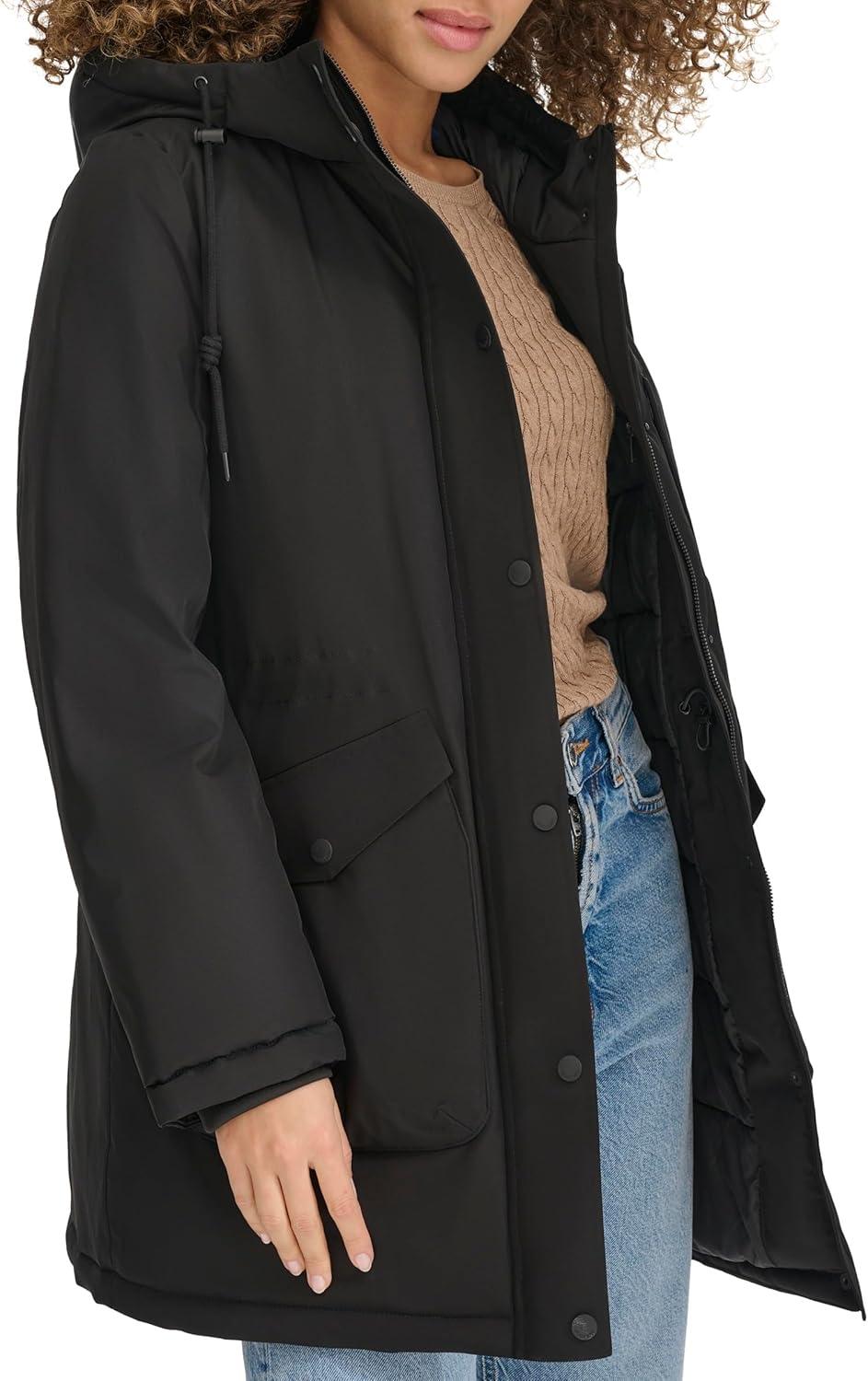 DOCKERS womens Cinched Waist Hooded Parka Jacket With Quilted Interior(Black)